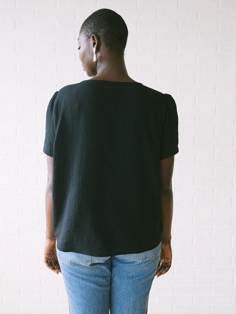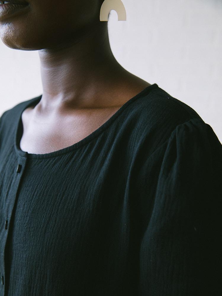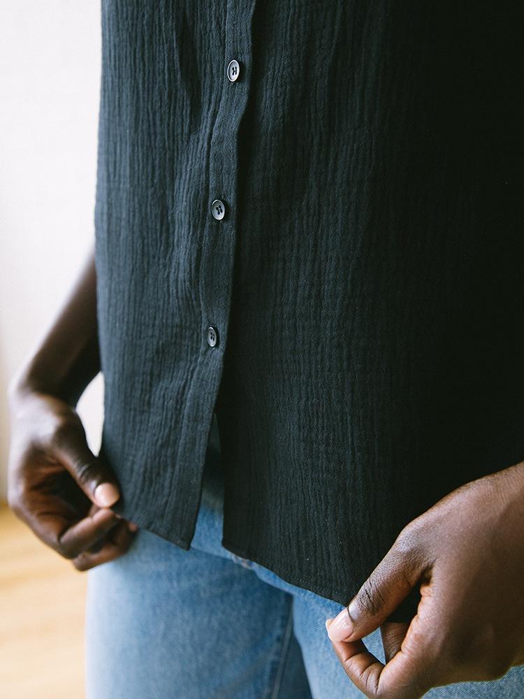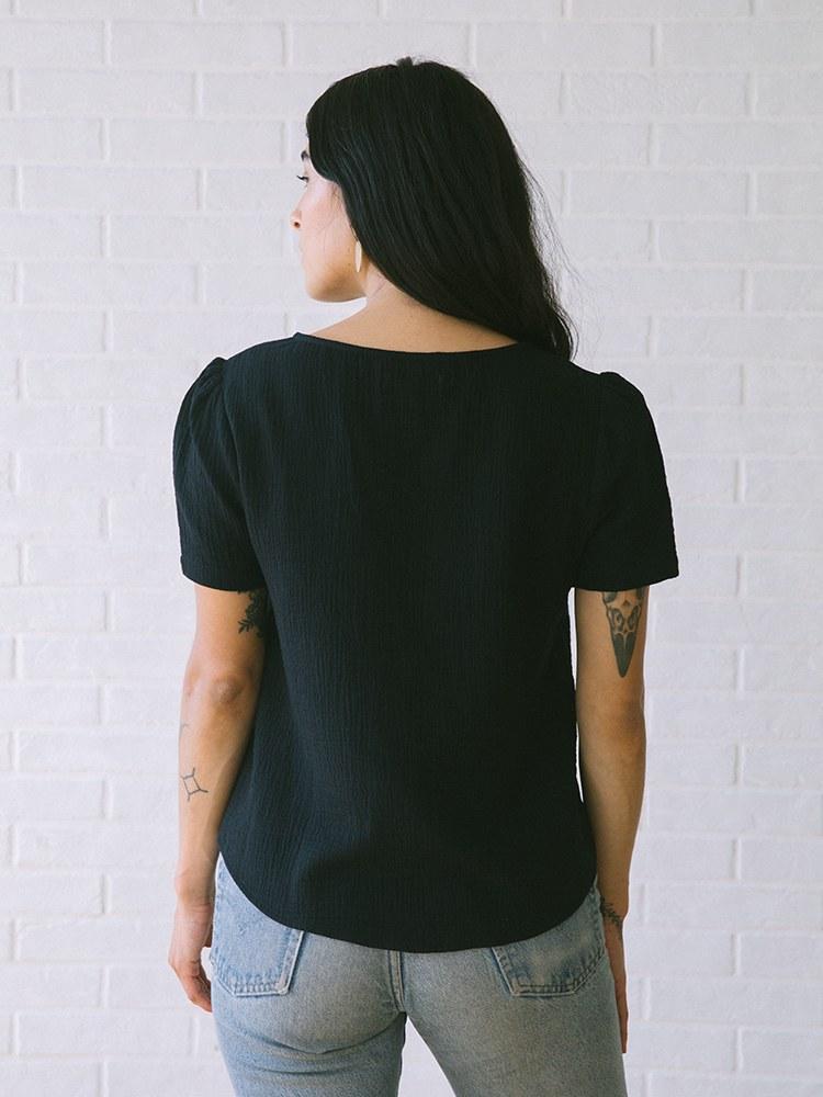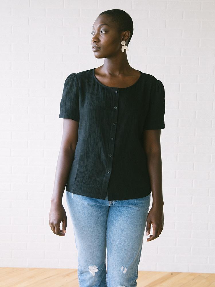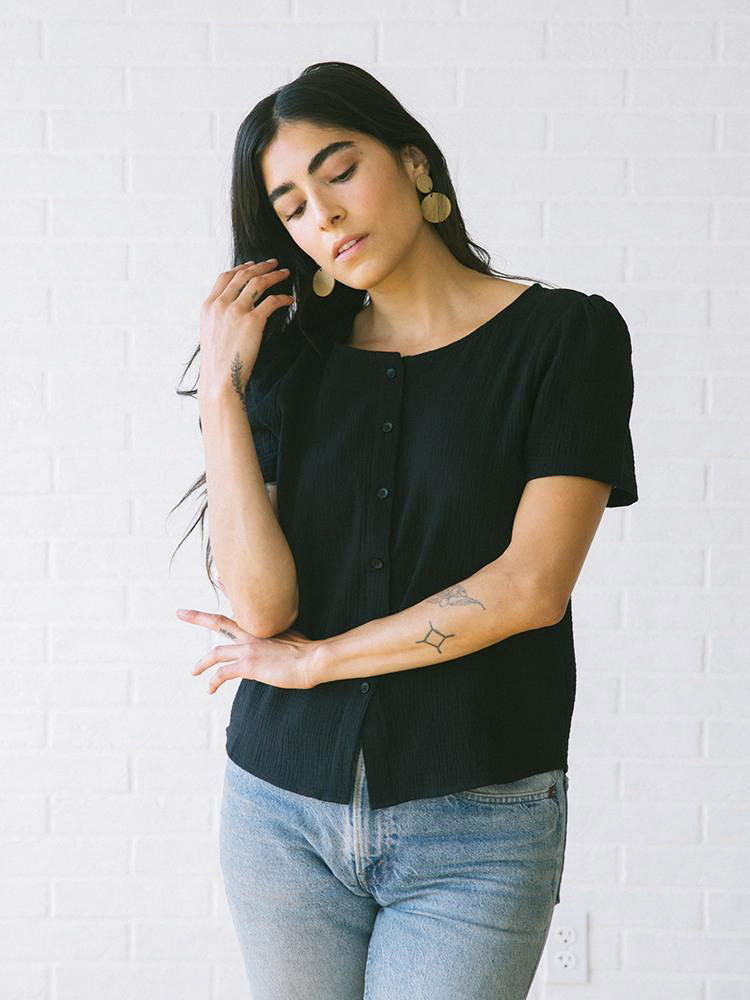 Inspired by a summer in Spain, the Barcelona Top is a textural, scooped neck button-up. Don't forget this sophisticated and cool essential on your packing list. Breezy and elegant, this shirt is the perfect summer staple. Signature details like puffed sleeves and refined double gauze make you feel like a million bucks from every angle. This top is breathable and lightweight, making it great to wear in hot temperatures.
